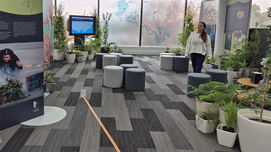 Featuring a 650m floor timeline representing 65,000 years of Aboriginal history, a museum-standard immersion room installation, 100 culturally significant plants found in Bunurong/Boonwurrung Country, storytelling soundscapes, podcast and short films from Elders, plus extraordinary artistic expressions, YOur Special Place has now become a permanent feature of the City of Casey’s Bunjil Place office.